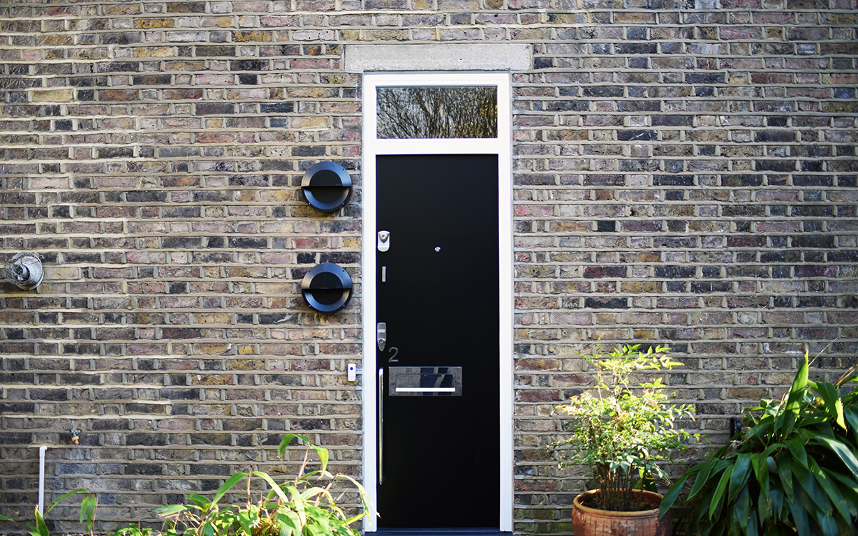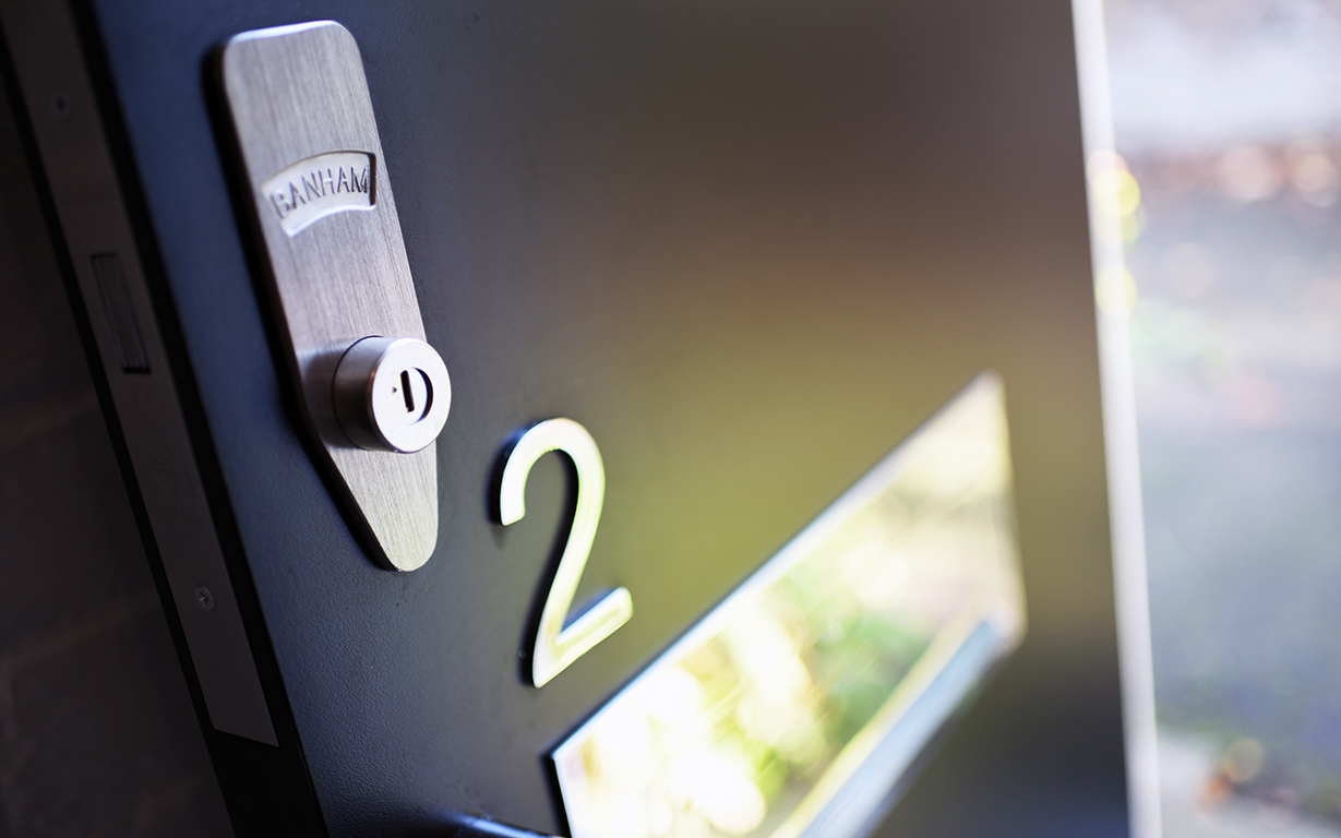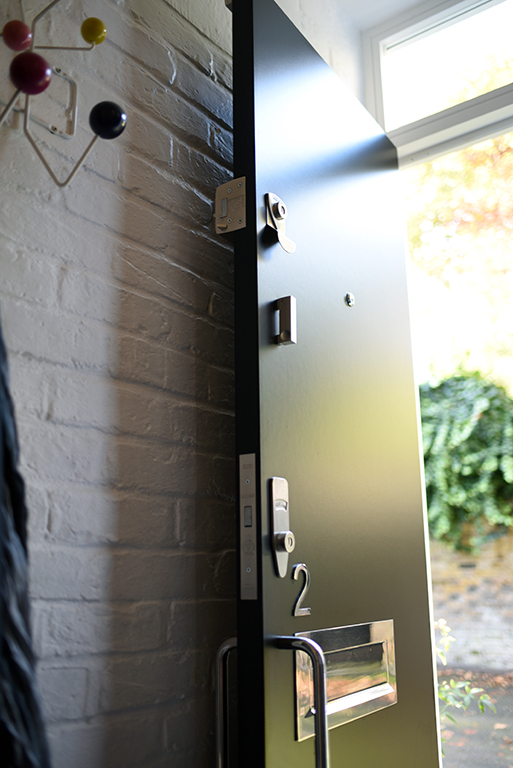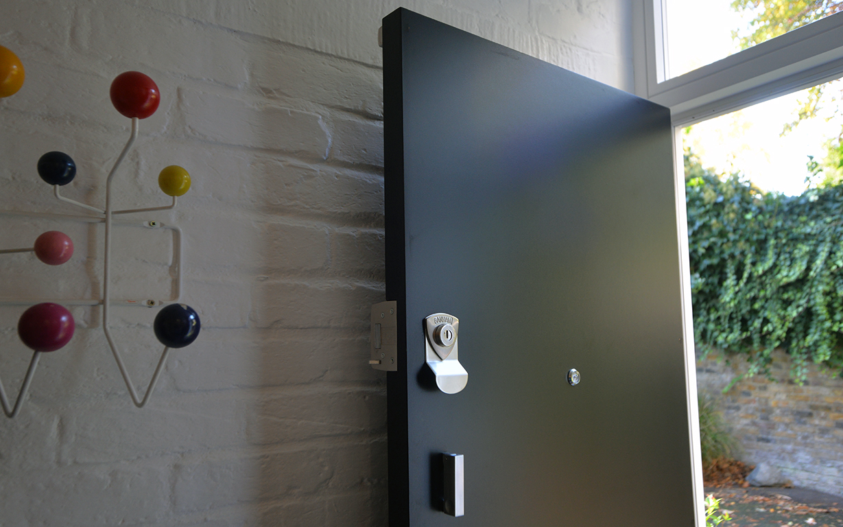 O ușă de acces personalizată – lemn masiv, fără panele, cu 2 încuietori Banham de mare securitate completează acest minunat proiect.