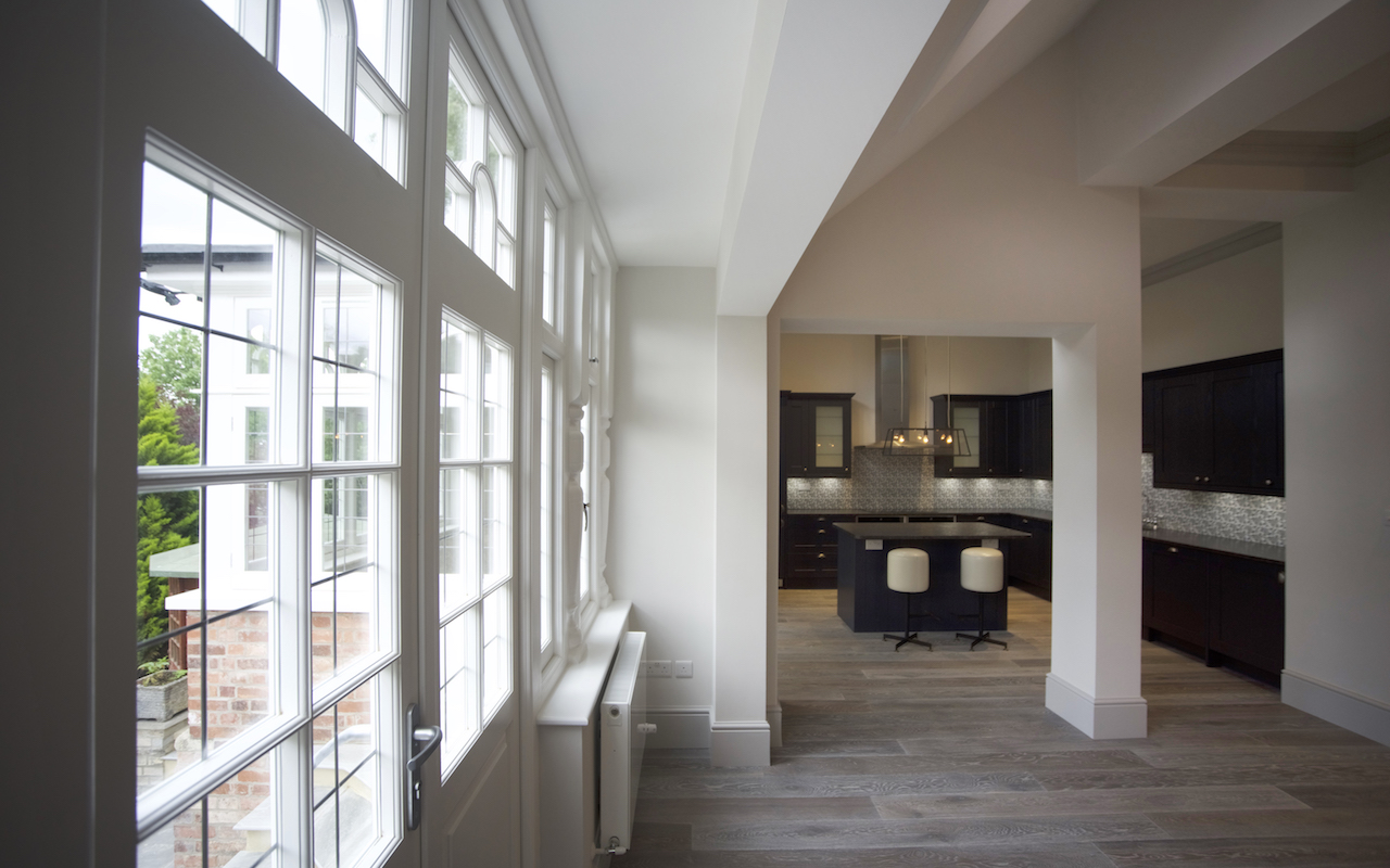 În partea din față, o gamă de ferestre cu ghilotina și păstrarea sticlei originale.